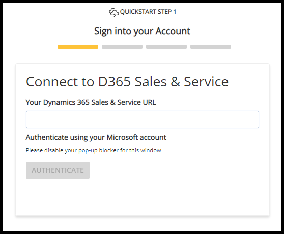 - Popup blockers should be disabled to allow for the D365 CRM authentication screen to appear in the QuickStart wizard.