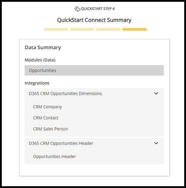 - At this time, only the Opportunities data is available for QuickStart.
