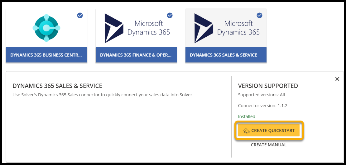 This article will detail the steps to set up and configure QuickStart for Dynamics 365 Sales, Field Service, and Customer Service, also known as CRM or Microsoft D365 CRM. QuickStart is a wizard-driven process made to assist you in quickly setting up an integration from your organization’s D365 CRM implementation to Solver Cloud.