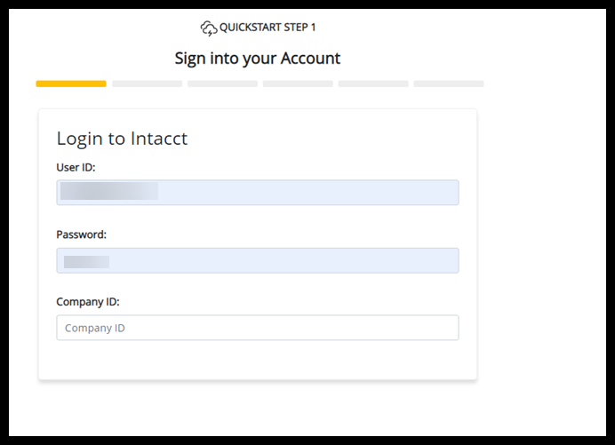 - Log in to Sage Intacct by entering your User ID, Password, and Company ID.