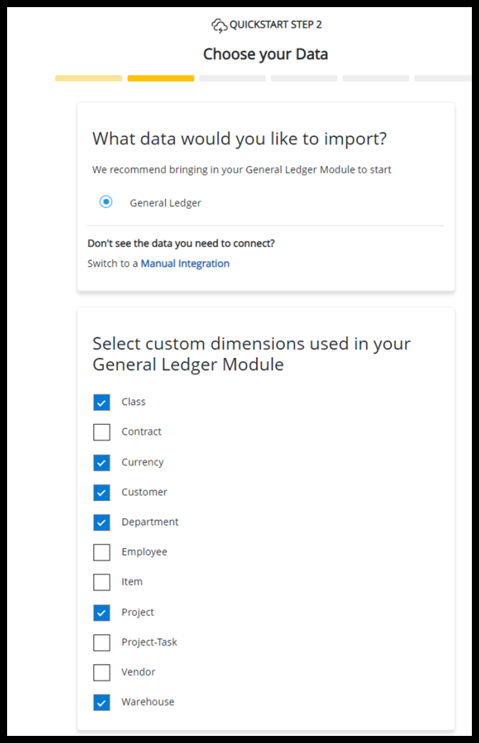- Select at least General Ledger and choose the Department dimension data for a standard integration.