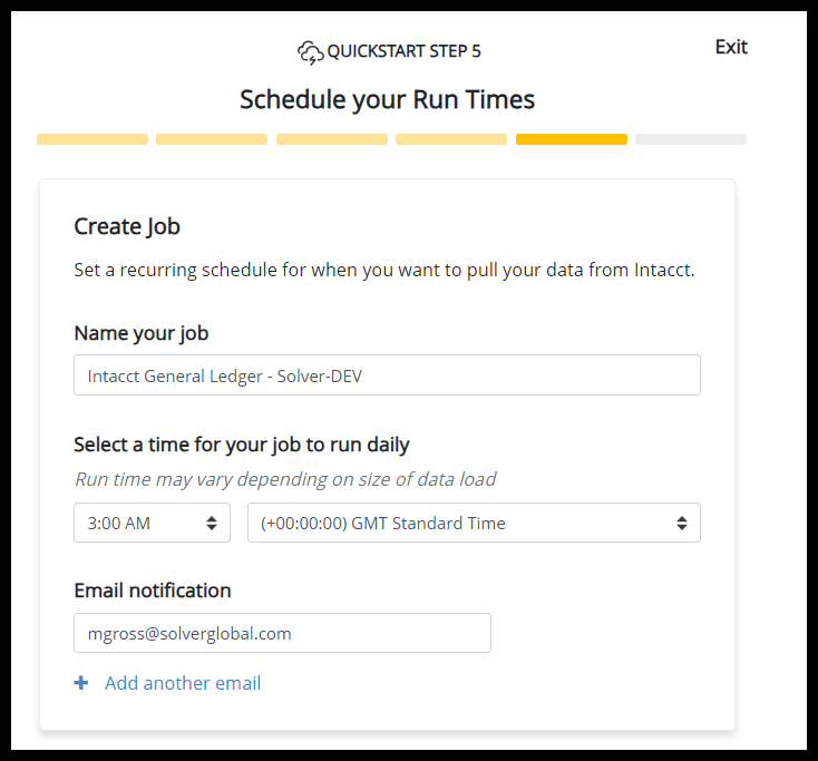 - Set up a name, runtimes, and frequency of the integration job as well as an email(s) for users who should receive integration status emails.