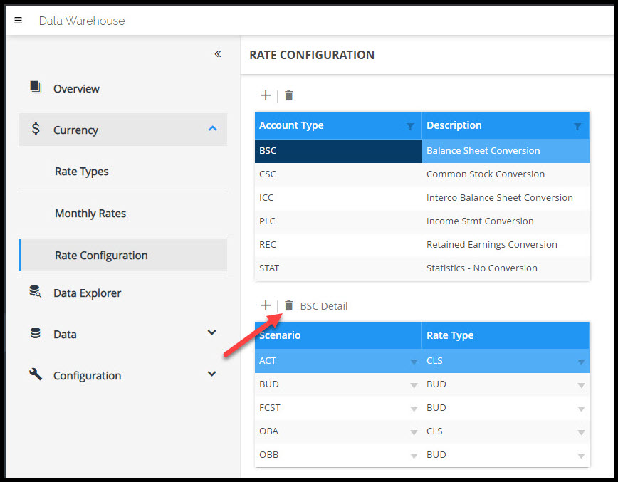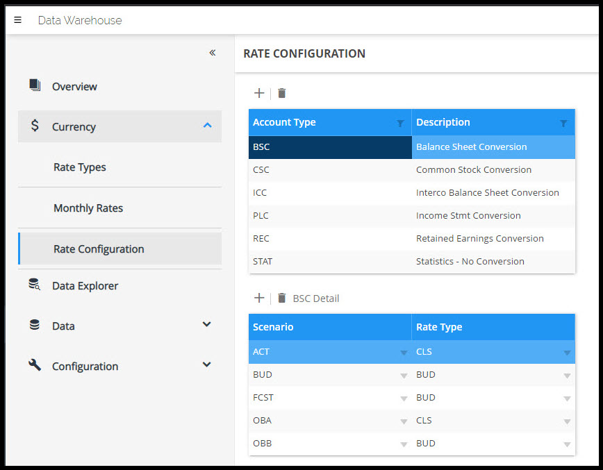 The Rate Configuration menu allows the user to define the Rate Type for a specific account type and scenario combination. This definition is then used in the currency translation process to create translated values.