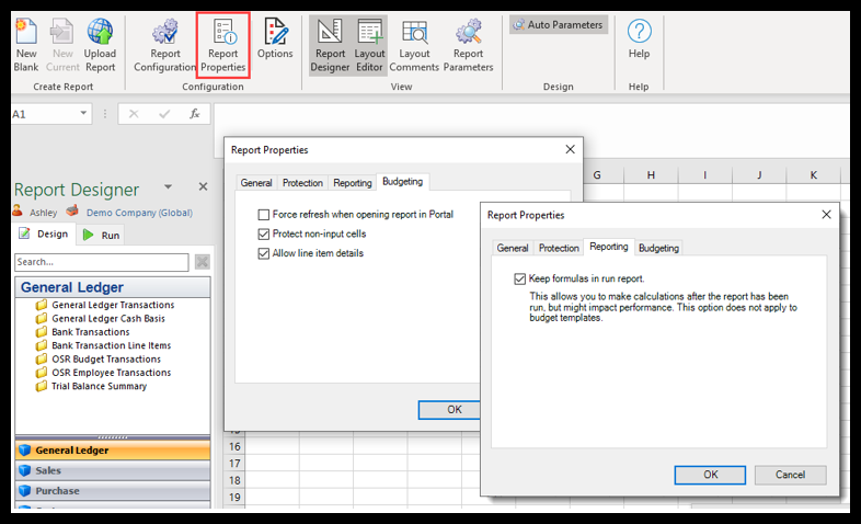 This article details the Reporting and Budgeting tabs on the Report Properties window found in the Report Designer ribbon in Excel. They can be accessed by clicking the Report Properties button. See the picture below: