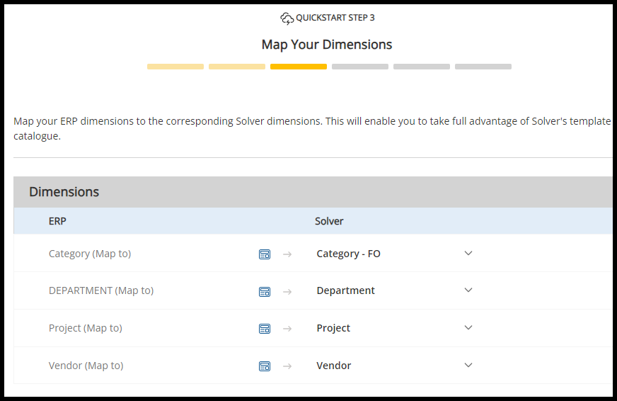 - The next screen is the dimension mapper. Use this screen to create and/or map your selected finance dimensions to dimensions within Solver. You can map to existing dimensions, Solver “standard” dimensions, or create your own dimensions by just typing in a name.
