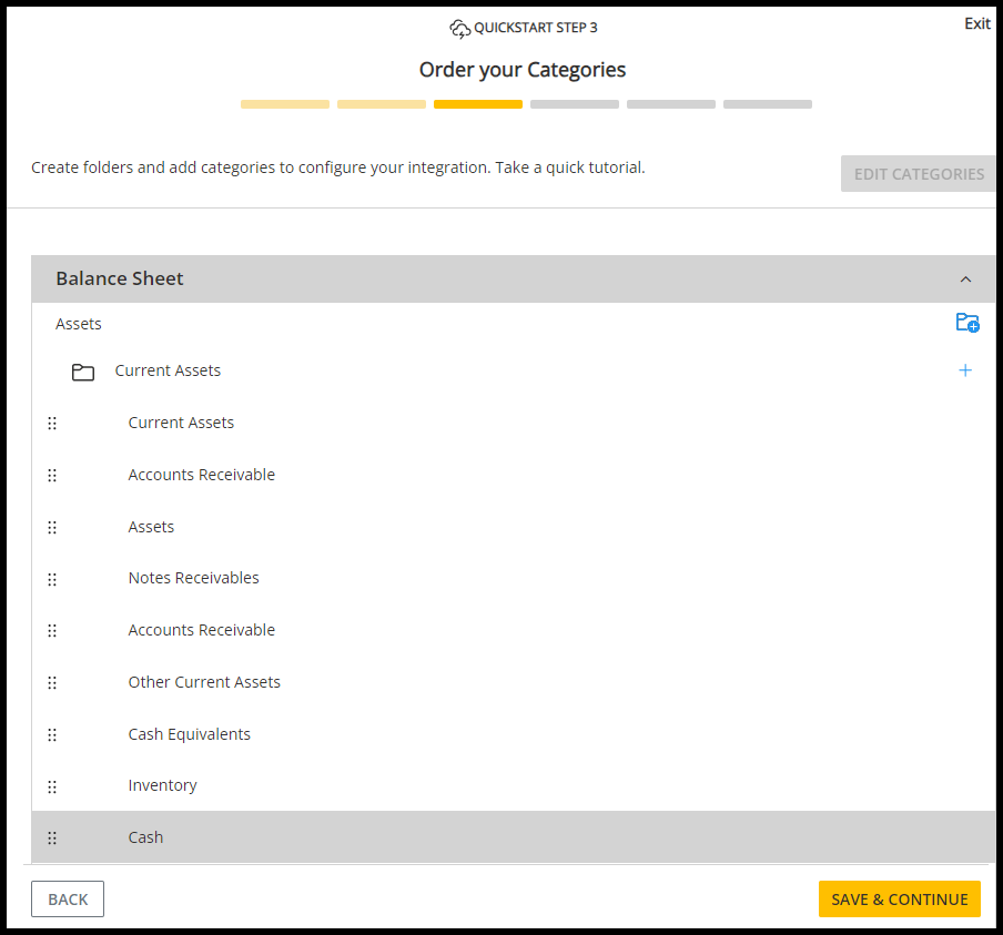 - The next screen is the Account Category mapper. Please map your account categories to the folders within Solver and click Continue.