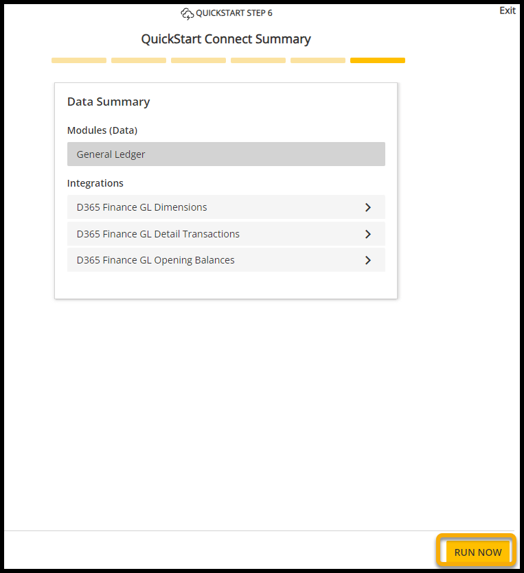 - The final screen, confirms your configuration and by clicking Run Now, your configuration is saved and QuickStart will execute.