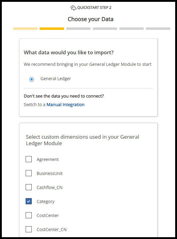 - The next screen prompts for the data that you’ll want to bring into Solver. Select General Ledger and its respective dimensions and click Continue.