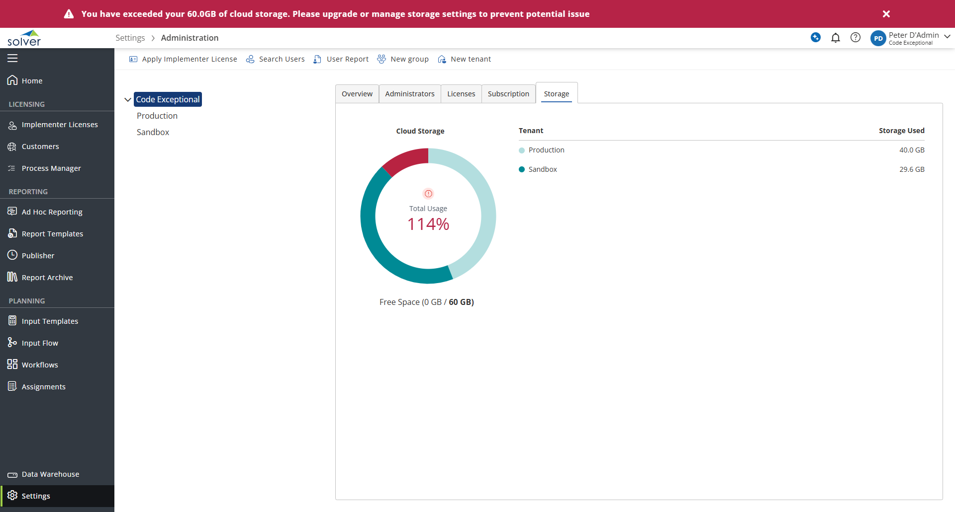 Additionally, Solver will email the customer admin(s) when you have come close to or met your storage capacity.