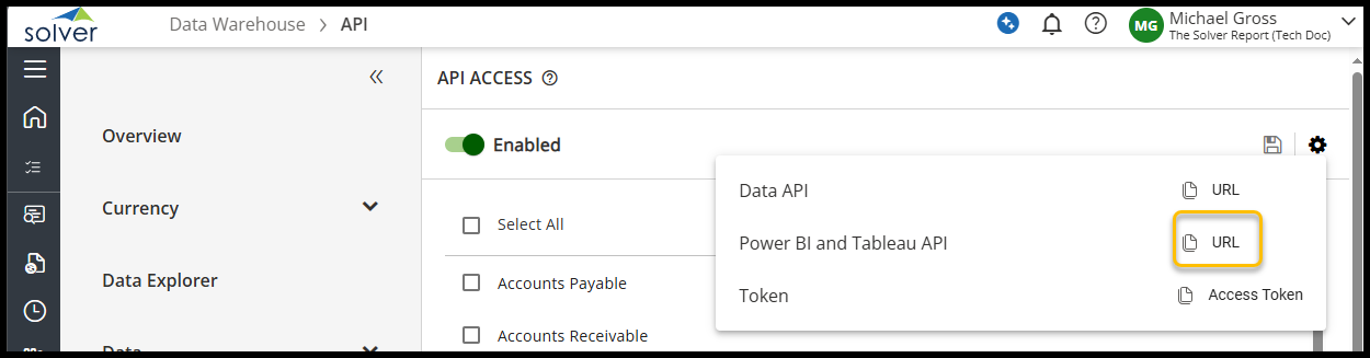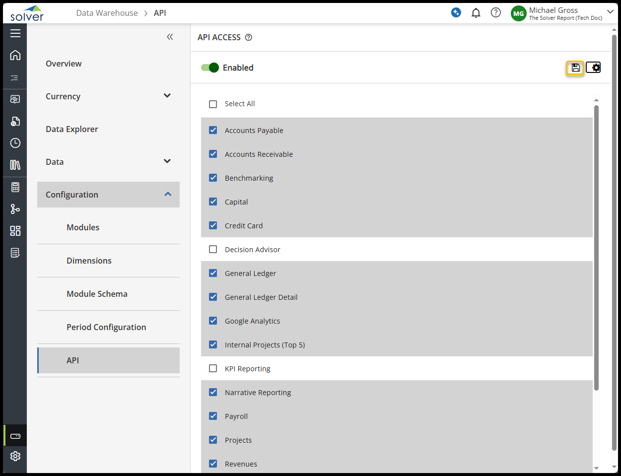 - Open the Solver Portal and navigate to the API screen, under the Data Warehouse -> Configuration menu.