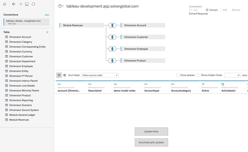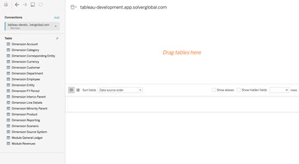 [The Solver Tableau connector is designed to extract data from the Solver Data Warehouse. Live connection is not currently available.]