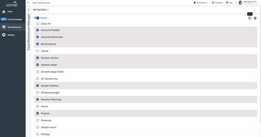 - From the Solver main menu, click Data Warehouse →Configuration →API