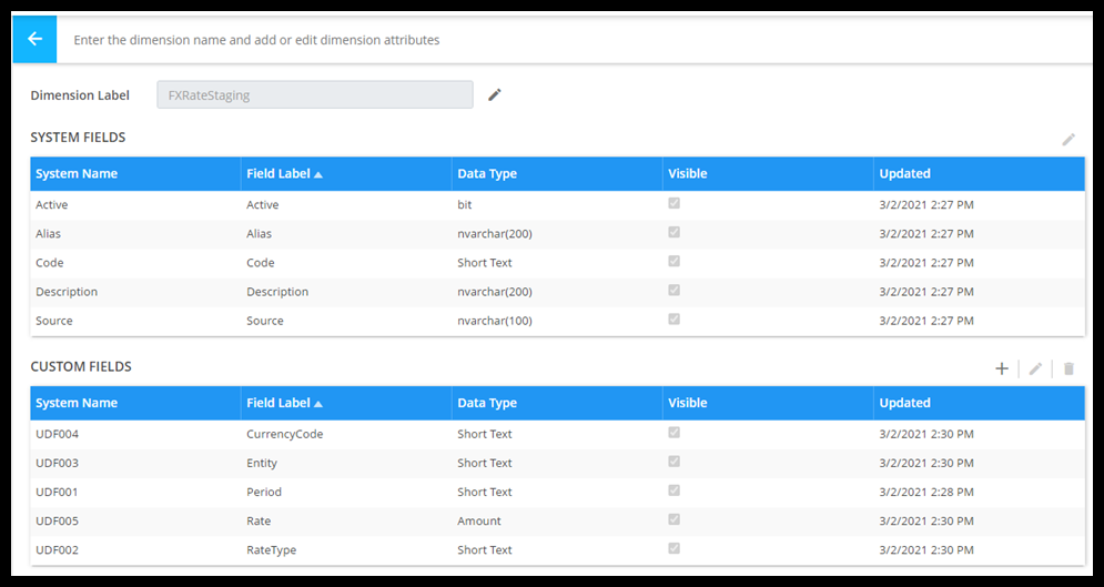 Some ERPs have currency rates that can be loaded into our system through an integration. This can be done from a file import too, but you can use other ERPs that have this information in their monthly rate table. The Dimension needs to be set up like this and must be named “FXRateStaging”: