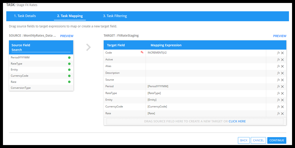 The important key columns are the Currency Code, Entity, Period, Rate, and RateType. These are all components that are necessary to load your Rates into the Solver tables. Once you create the Dimension, you can then go to create the integration and will need to configure the task mapping: